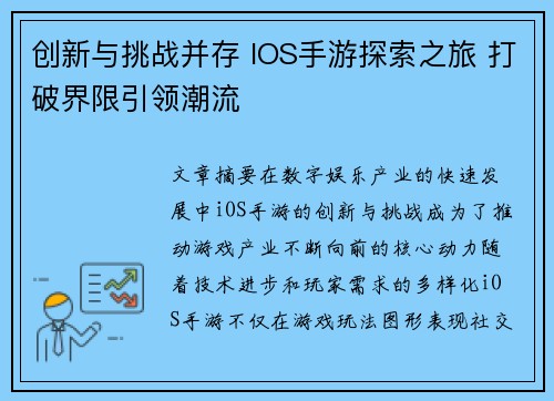 创新与挑战并存 IOS手游探索之旅 打破界限引领潮流