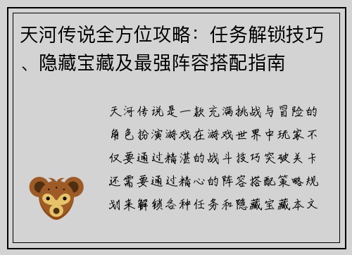 天河传说全方位攻略:任务解锁技巧、隐藏宝藏及最强阵容搭配指南